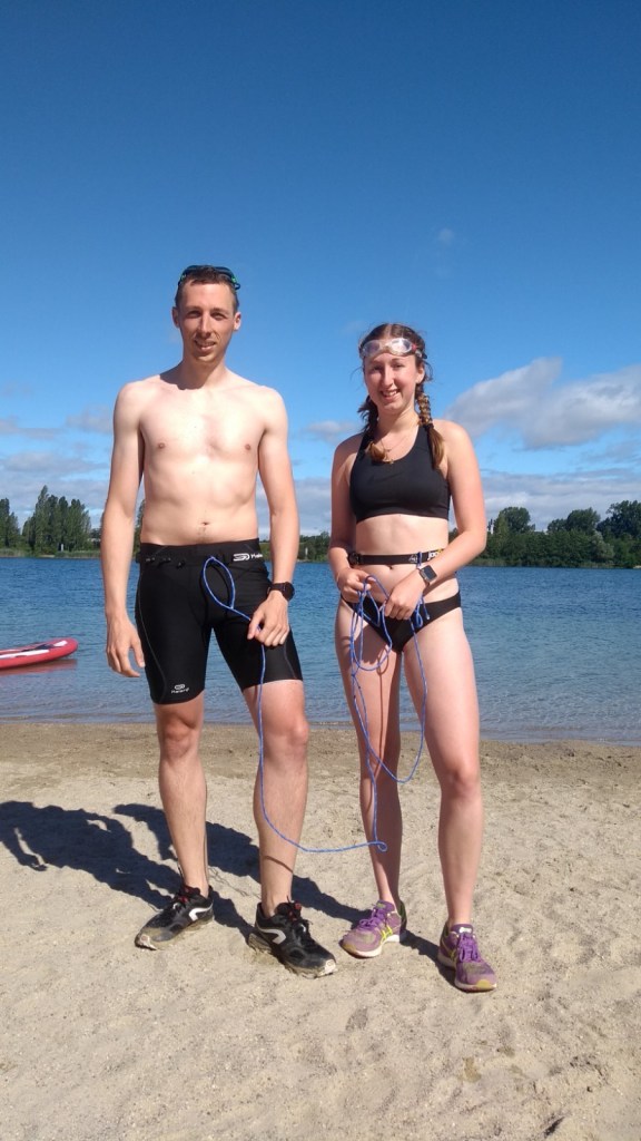 Nouvelle idée pour pimenter cette année, une épreuve en duo, tel un « vrai » swim & run, relié par une longe d’environs 5m pour toute la course.