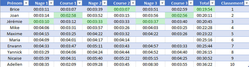 A l’issu de ces trois enchainements, c’est finalement Brice qui en termine en moins de 20min, quelques secondes devant Joan puis Jérémie. Les 7 autres participants ne déméritent pas non plus pour autant, en donnant tout ce qu’ils ont pu pour aller chercher la ligne d’arrivée.