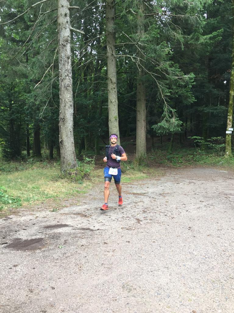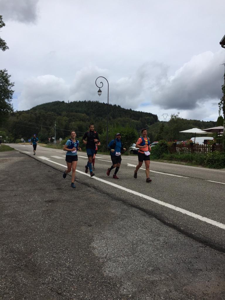 Un départ à la lueur des frontales, des traileurs ultra motivés, on pourrait se croire à la fameuse Saintélyon. Distance et dénivelé plus ou moins similaire. La plus grosse différence, une météo idéale pour courir dans de bonnes conditions.Un levé de soleil sur les crêtes, avec les copains et les chamois pour nous encourager c’est vraiment top. Un premier ravito avalé à grande vitesse, le temps de remplir les flasques et on repart avec mes 2 compères de courses. On entame une partie plutôt rapide direction ravito 2, on ne traîne pas pour grappiller du temps sur les poursuivants (à une 10aine de minutes derrière). Arrivée au 2ème ravito, il y a nos supers bénévoles qui nous ont dressés un vrai festin du traileur (saucisson, fromage du jura, Tuc,…) on pourrait rester la. On nous annonce que les copains du 50km sont pas loin devant. Objectif : les rattraper avant le dernier ravito. On quitte Sainte Marie le ventre plein prêt à attaquer une grosse et longue montée (toujours difficile le ventre plein et après une pause de 10min). Une fois cette difficulté passée on continue une portion de 20km sans grosse difficulté sur laquelle on arrive à rejoindre Judie, Nathalie et Nicaise qui sont sur le 50km. Il nous reste 5km jusqu’au ravito. Judie décide de s’accrocher et part avec nous pour arriver au col de Steige ou les randonneurs et nos bénévoles nous attendent pour le dernier ravito. Alex et Gilles repartent 2 minutes avant pour attaquer les 10 derniers km. Je ne les reverrais plus jusqu’à l’arrivée. Je croise certaines personnes du 50km, on s’encourage et se motive mutuellement. Un peu plus de 500 mètres à faire encore, j’arrive au niveau d’Anne qui a pour objectif de vouloir faire moins de 8 heures mais n’y croit plus, je la motive on s’encourage sur les derniers mètres, on voit la ligne. Fini ! Objectif réussi 9h53, à 3 minutes de mes compères. Une super aventure entre copains, super organisation! Vivement la 2ème édition et pourquoi pas une Crazy Race en aller-retour en solo ou en relais?