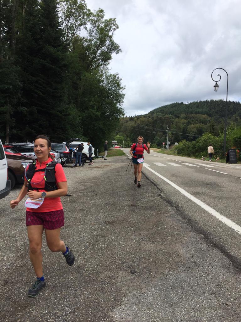 Par contre, je sens le manque d’entraînement dans les descentes avant le col de Sainte Marie. Après le ravito de Sainte Marie, ça se complique un peu et je commence à avoir les jambes dures. Pas d’entraînement, pas de surprise. Mais les amis du CRC sont là donc ça le fait. On se dit que l’on a beaucoup de chance avec la météo. On commence à suivre les autres groupes avec le WhatsApp. Tout se déroule bien, c’est génial. Enfin le ravito de la Steige ! On prend notre temps parmi les cyclos. J’ai un regain d’énergie, il ne reste plus que 10 km avant l’arrivée (en montée mais on s’en fou). Arrivé à 5 km de l’arrivée, je vois Max accélérer. Je décide de le suivre. On se raconte nos histoires et nos motivations avec Max sur un bon rythme de course. Ça rappelle des souvenirs (recoucou la Saintélyon). On passera la ligne d’arrivée ensemble.